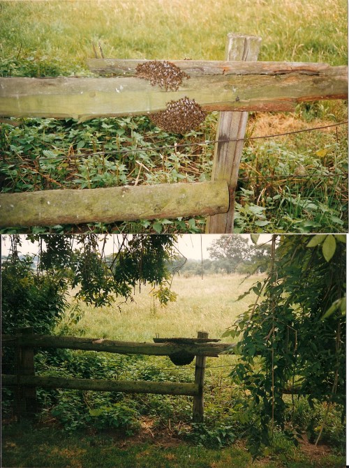 Here is the swarm on the fence after it had landed and before it was caught. What happy memories!
