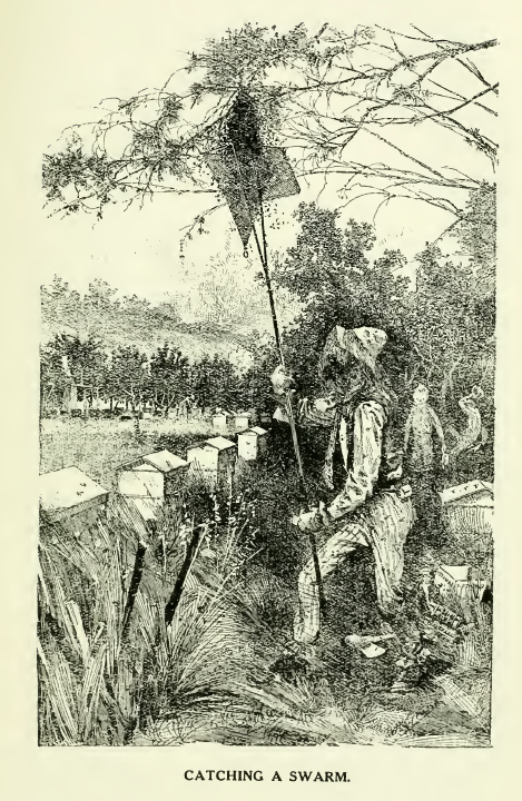 “Perhaps the one stage in bee-keeping that requires the least protection and minimum of courage is “swarm catching” – that is, taking natural swarms after they have alighted in a cluster on a bush or other object they have chosen for the purpose. To me, it is one of the most interesting sights in Nature to watch a swarm leaving the parent stock, rising on the wing, and performing beautiful, mazy evolutions like a country dance mid-air, to the accompaniment of a soft, melodious, gentle hum, so indicative of peace, goodwill, and enjoyment at the prospect of establishing a successful home of their own; the main body keeping up these beautiful movements whilst the scouts are flying hither and thither in search of a suitable spot on which to alight; and then to see them hasten to a bush in thousands, and threading in and out amongst foliage, and now here, and there, until the scouts trumpet forth the call to assemble. I have never yet discovered that call, but it must be well known to the bees; for when the spot on which to alight is found, and the call is made, you will see all the bees that are on the wing head towards it, even those that form the most distant circle.